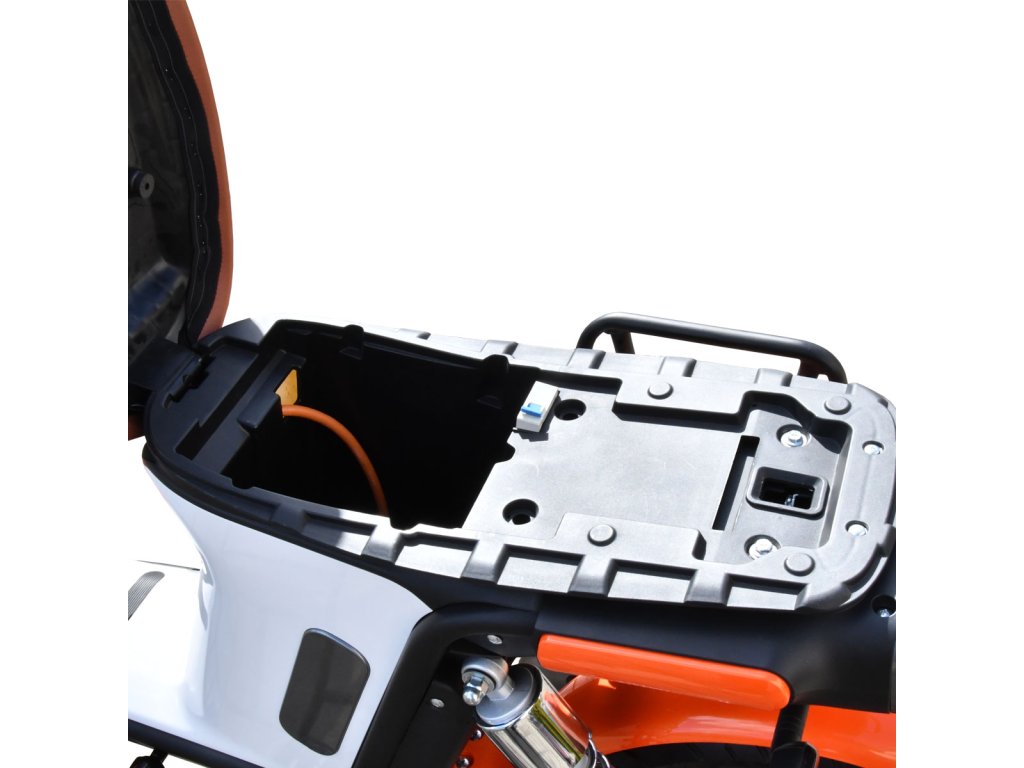 Skútr je vybaven už jen LITHIOVOU vyjímatelnou baterií o kapacitě 20,8Ah, kterou si můžete odnést domů nabít, je však možnost dokoupit a zaměnit za lithiovou baterii 40 Ah s dojezdem až 100km